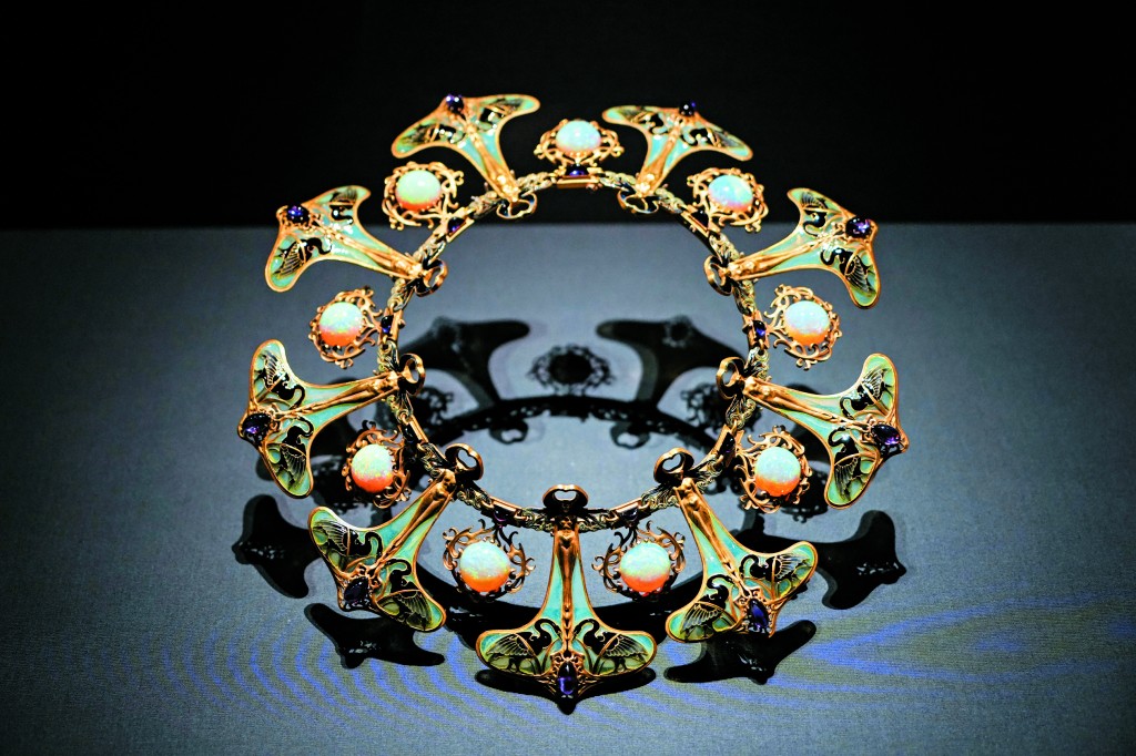The exhibition begins with the basics: how jewelry adorns the body. A highlight is a 19th-century necklace by French glass and jewelry master Rene-Jules Lalique, whose sensual, Art Nouveau designs were inspired by the female body. Fused with gold, enamel, opals and amethysts, the necklace was a gift to his wife.