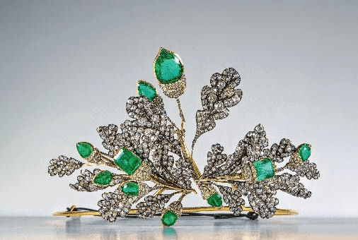 Jewelry was also seen in the past as royalty embodied. A silver tiara embellished with emeralds, contributed by the ILLUMINATA Collection, comprises three English oak-leaf sprays that, in 19th-century Britain, signified national strength and regal authority.