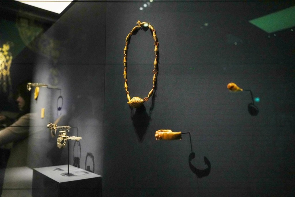 The exhibition then turns to jewelry's perceived relationship with the divine. Standing out are a pair of gold sandals and toe stalls used for the ancient Egyptian burial of pharaoh Thutmose III's wife, believed to safeguard her journey into the afterlife.