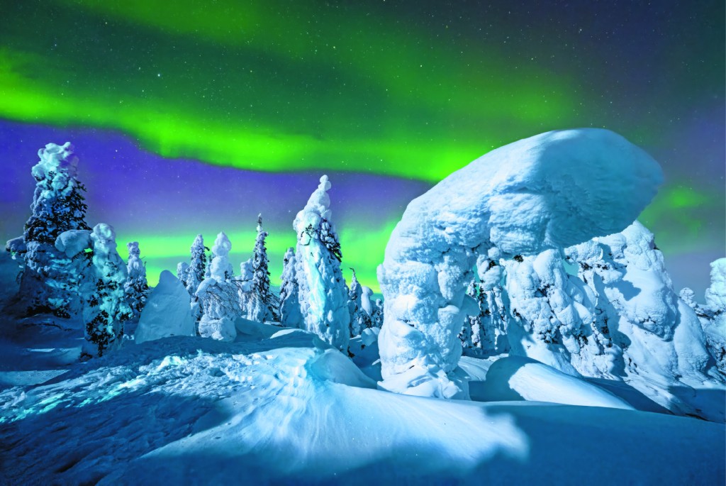 A snow-covered landscape in Alaska with the northern lights and the moon.