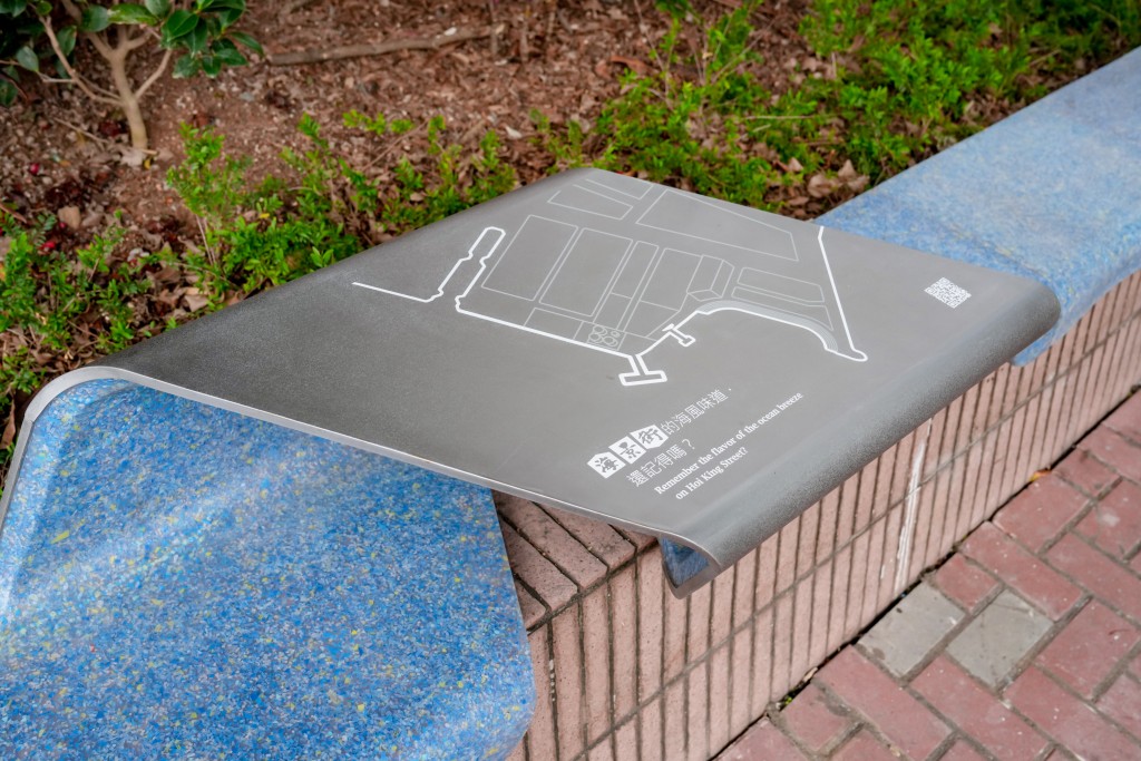 One of the project's latest installations, Tidal Stories, sits outside a nursing home on a tree planter on Pok Man Street. Created from unused face masks and other waste materials collected from the nearby facility, the work functions as both art and public seating.