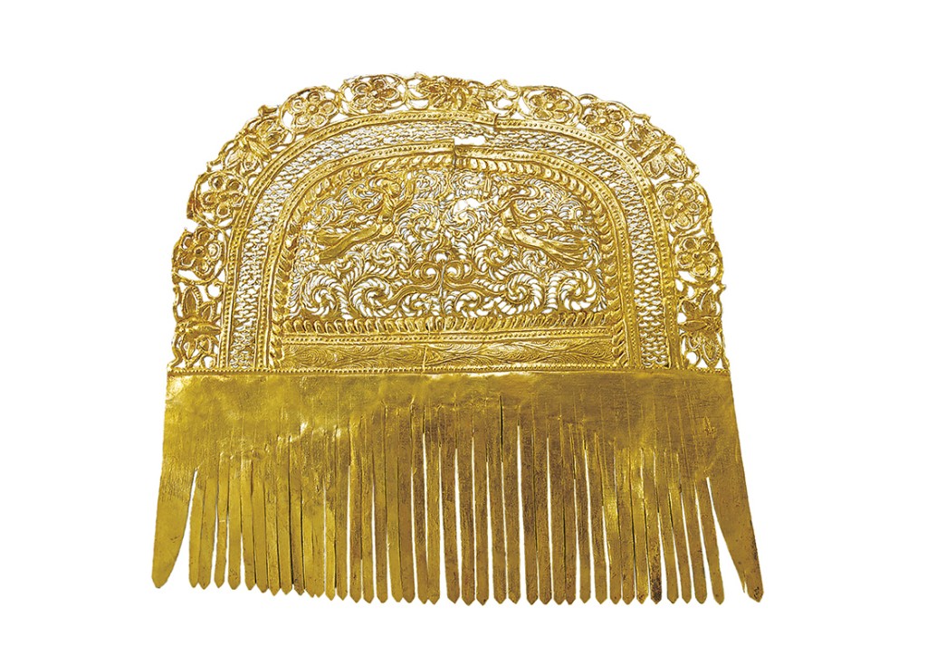 Also, the Tang dynasty was a time of great fashion, and women loved to decorate their hair with beautiful ornaments called jie. The displayed gold jie comb is decorated with celestial figures from Buddhist art.