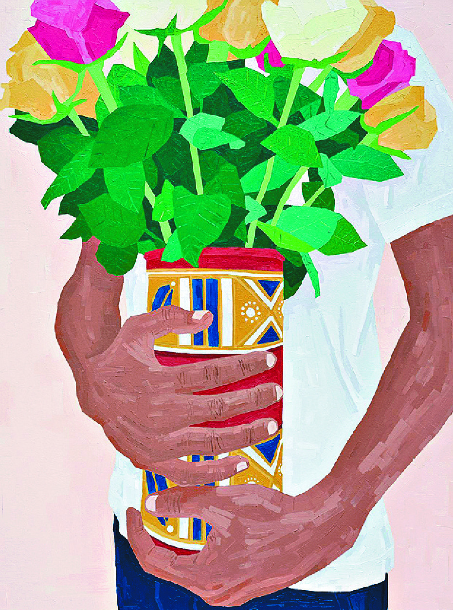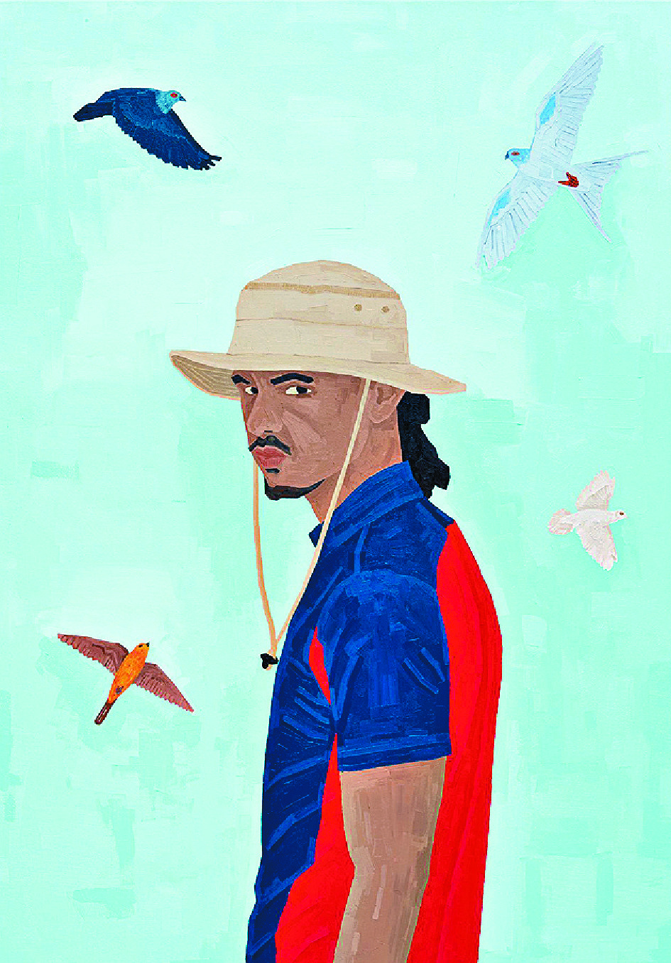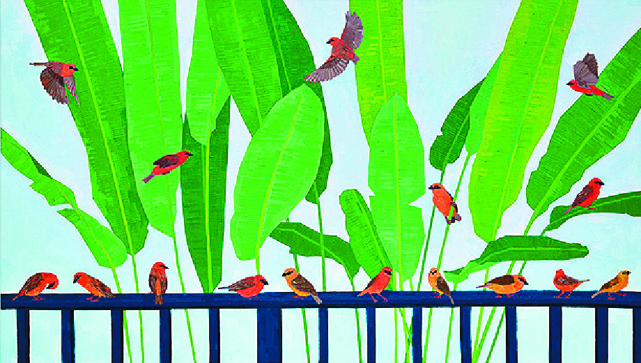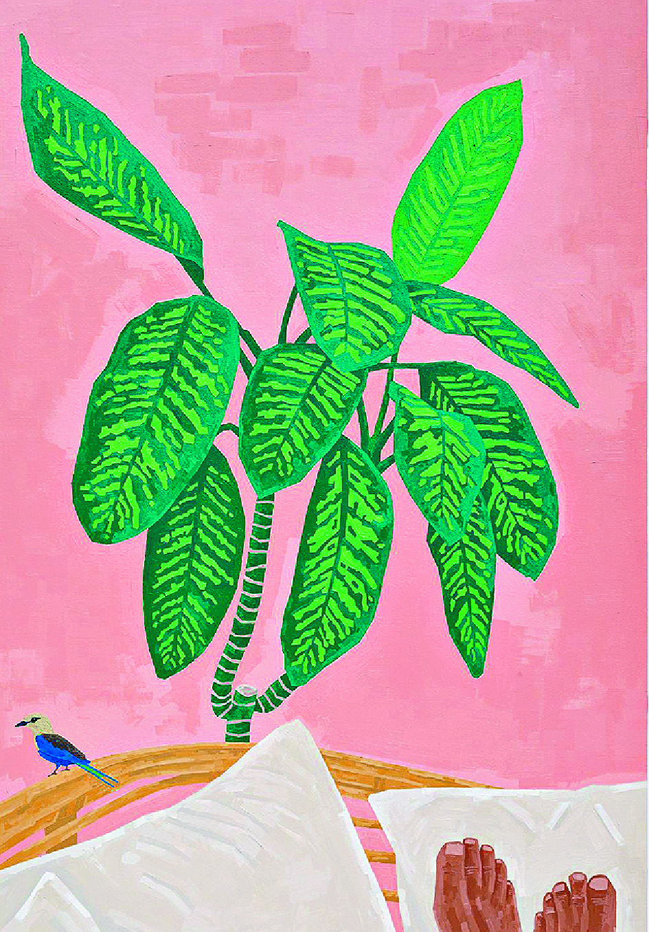 Plants are not the only reference to his hometown in the paintings. In Birds of Teranga, a tiny bird appears alongside the leaves of musa, while the artist's feet casually dangle off the bottom of the canvas. The bird is called teranga, meaning "welcome" in Wolof, the language spoken in Senegal.