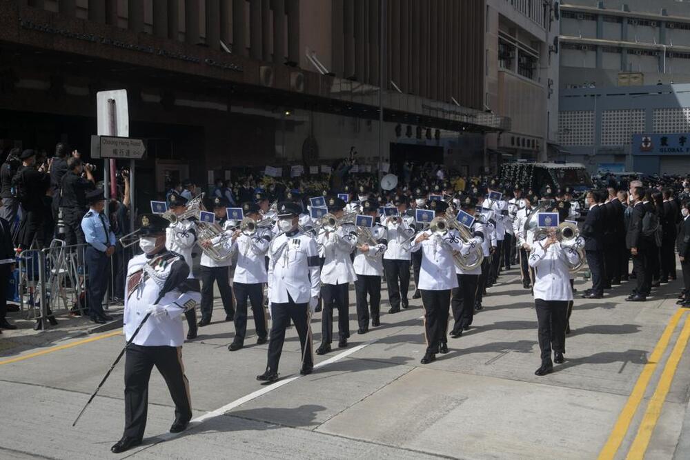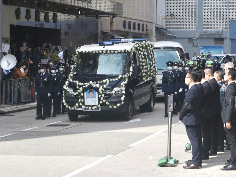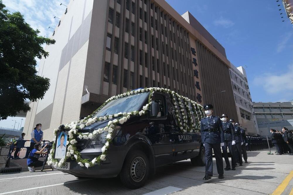 Dressed in dark attire, major officials including Chief Executive Carrie Lam Cheng Yuet-ngor, Financial Secretary Paul Chan Mo-po, Secretary for Security Tang Ping-keung and Commissioner of Police Siu Chak-yee, gathered at the Universal Funeral Parlour in Hung Hom to attend the full-honor traditional ceremony and a police force ceremony.