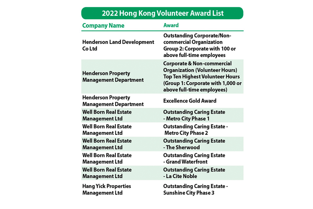 At this year’s Hong Kong Volunteer Award, Henderson Land Development Company Limited (Henderson Land) and Henderson Land Property Management Department were honored with a number of major awards, namely “Outstanding Corporate/Non-Commercial Organization – Top 10 Highest Volunteer Hours”, “Corporate & Non-Commercial Organization (Volunteer Hours)”, “Excellence Gold Award” and “Outstanding Caring Estate”. Henderson Land’s Executive Director Mr. Suen Kwok Lam and Advisor to Chairman Mr. Johnny Yu stress that Henderson Land continues to uphold its motto and spirit to help and contribute to society, as well as to promote volunteering to all staff members to care for each other.