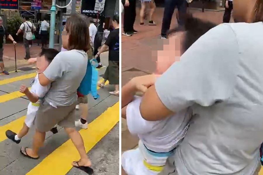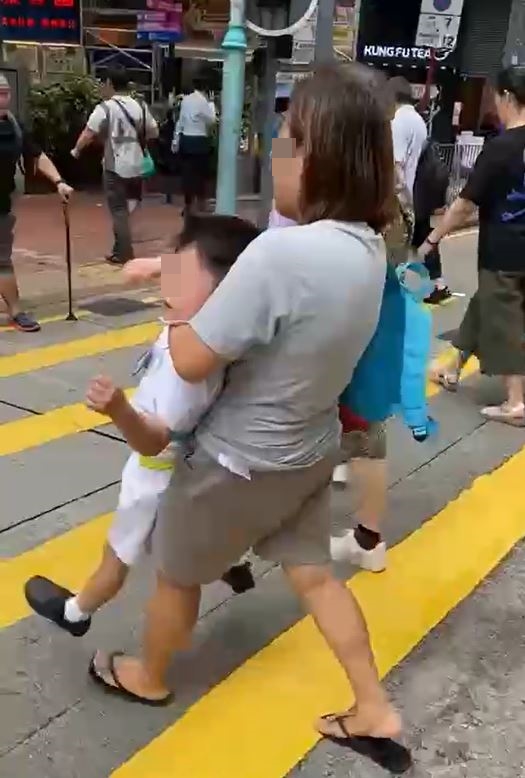 A domestic helper was filmed putting her arm around the neck of a kindergarten pupil to lift him off the ground and carry him across the road in a stranglehold, leading to criticism of suspected child abuse.