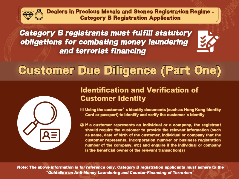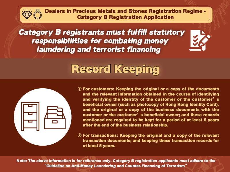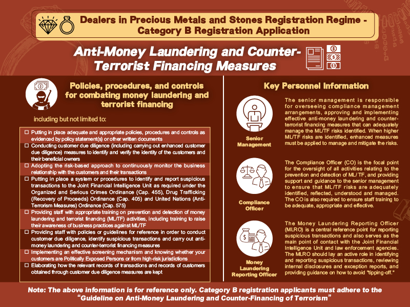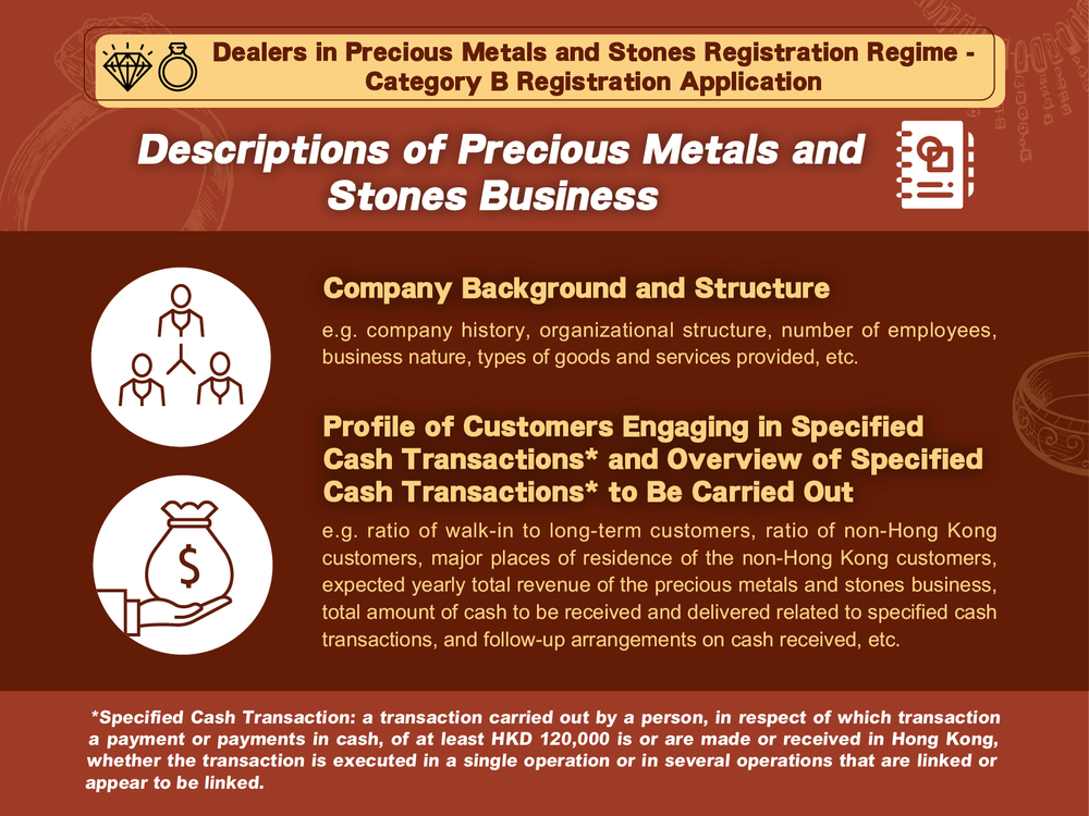 The applicant can choose to fill in and submit the proforma on “Descriptions of Precious Metals and Stones Business & Anti-Money Laundering and Counter-Terrorist Financing (AML/CTF) Measures”, or submit the applicant’s own descriptions of precious metals and stones business & AML/CTF measures which include: