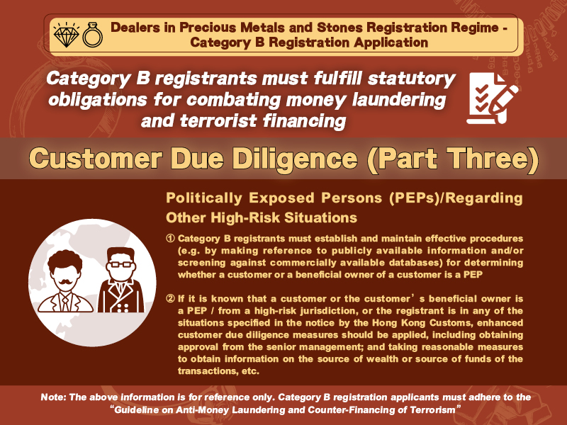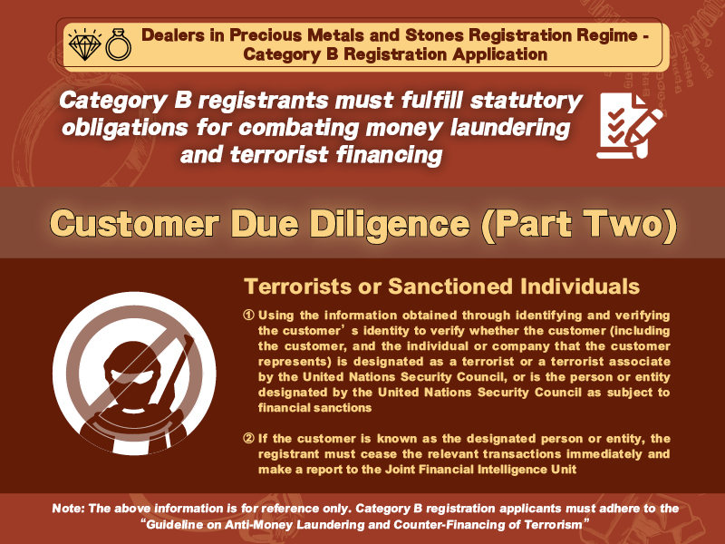 A Category B registrant is required to fulfil the following statutory obligations for combating money laundering and terrorist financing when conducting cash transaction(s) with total value at or above HKD 120,000. These obligations include, but not limited to: