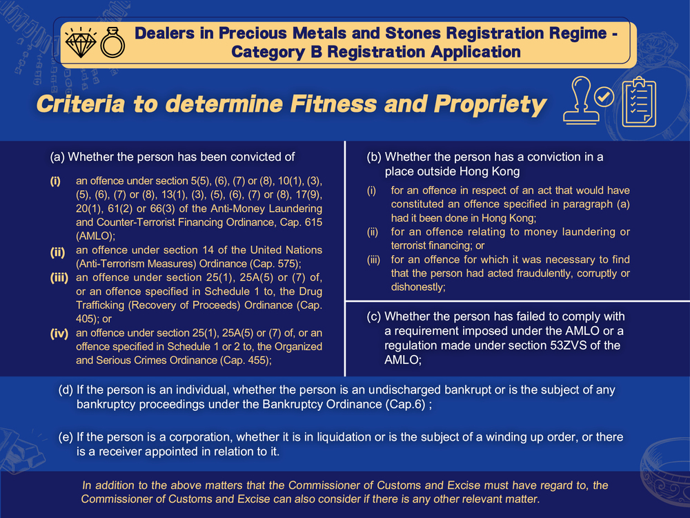 The Commissioner of Customs and Excise (CCE) may grant a Category B registration to an applicant only if the CCE is satisfied that the licenced hawker / the sole proprietor / each partner (including each corporate partner) / each director (including each corporate director), and each ultimate owner (if any), is a fit and proper person.