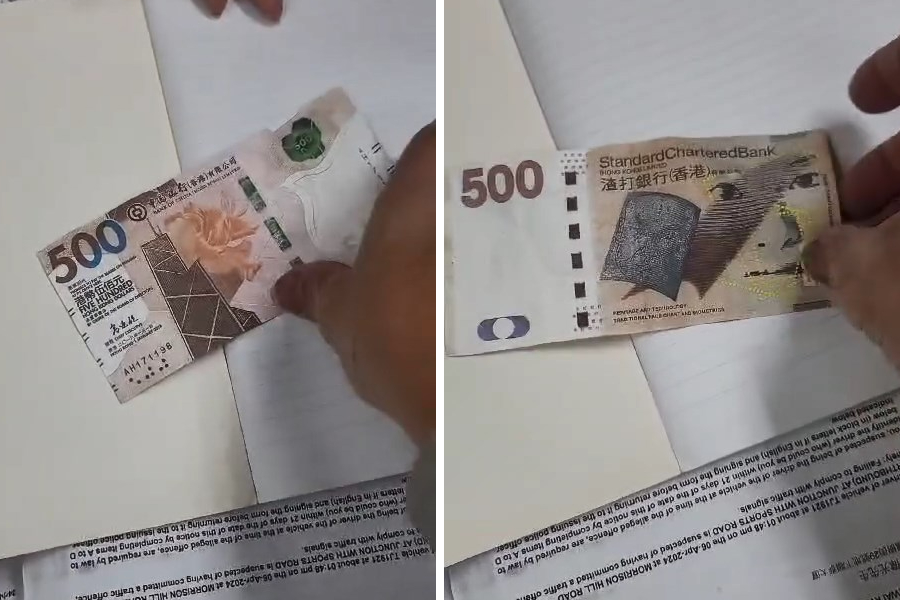 From the video, the fake banknote’s front looks identical to the HK$500 note issued by the Bank of China, yet its back was printed with the HK$500 print as seen in the banknote issued by the Standard Chartered Bank.