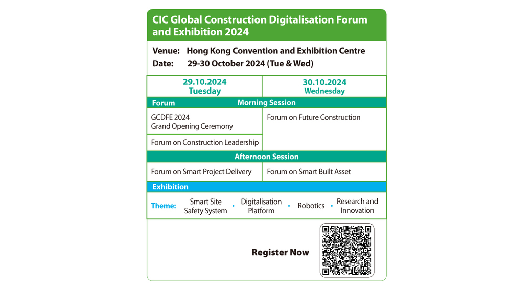 The Construction Industry Council (CIC), together with the Government’s Development Bureau, is showing the way by organising the CIC Global Construction Digitalisation Forum and Exhibition 2024 (GCDFE2024) to be held on October 29-30 at the Hong Kong Convention and Exhibition Centre, where an assembly of over 30 experts and 40 leading firms from all over the world will share their expertise in the concerted drive to total digitalisation of the industry.