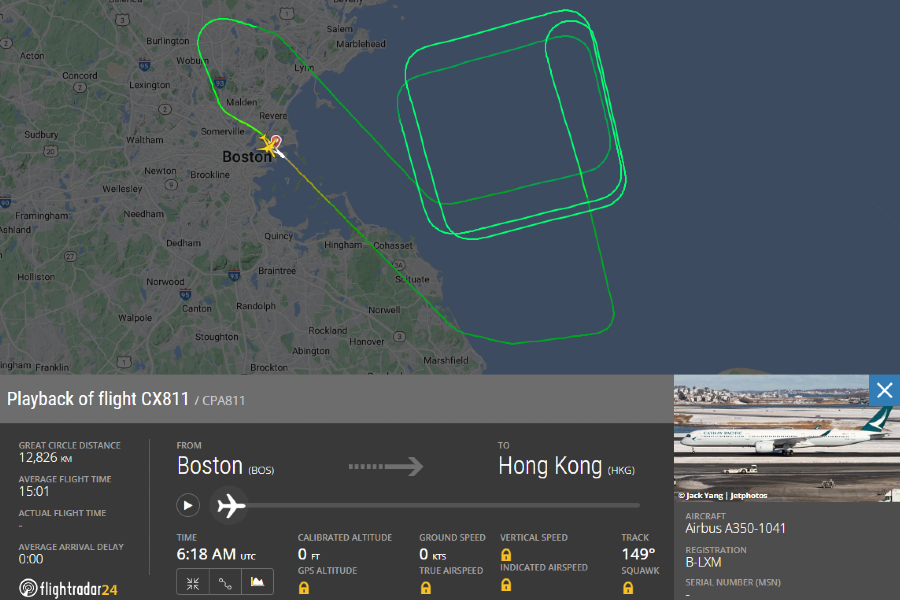 The flight CX811 departed the Boston Logan International Airport at 3.23 pm Hong Kong time Monday and was scheduled to arrive in the city at 5.21 am the following day.