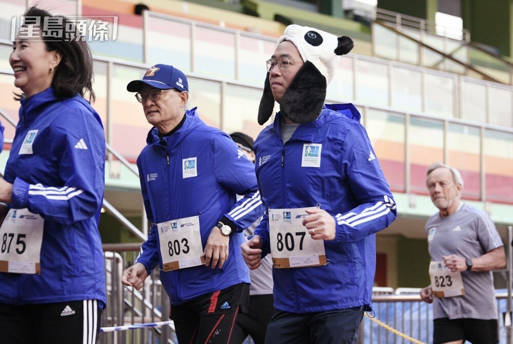 More than 40 political and business leaders joined the Standard Chartered Hong Kong Marathon Leaders Cup on Sunday morning, with Ocean Park chairman Paulo Pong Kin-yee donning panda hoods to “run on behalf of” the first Hong Kong-born giant panda twins.