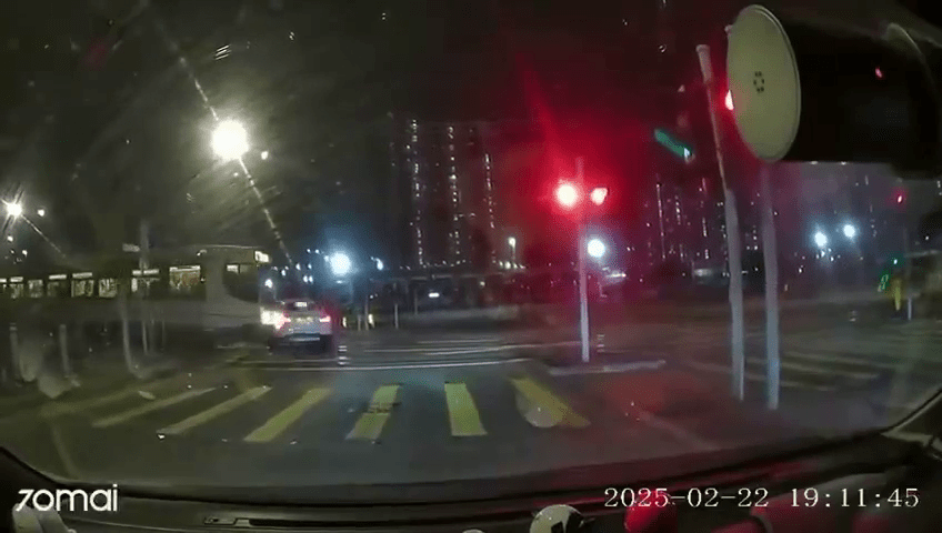 Dashcam footage shows the driver waiting at the intersection of Hoi Wong Road and Hoi Wing Road, but it suddenly ran the red light, ignoring honks from another vehicle and the approaching light rail train.