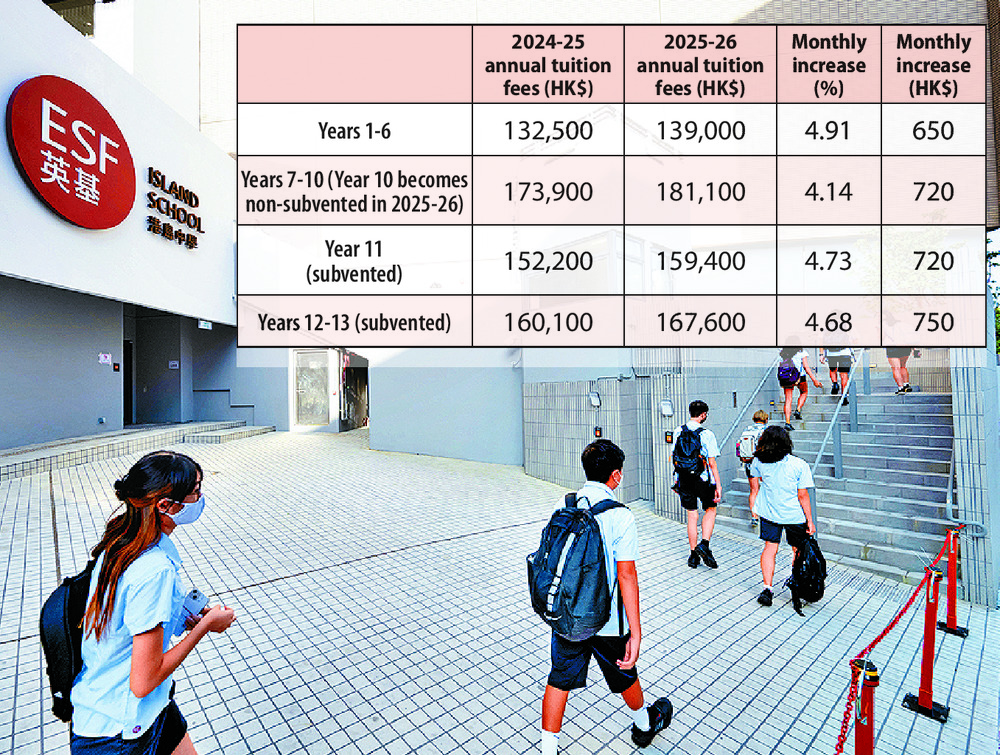 Year 11 will see fees climb from HK$152,200 to HK$159,400, and years 12 to 13 from $HK160,100 to HK$167,600.