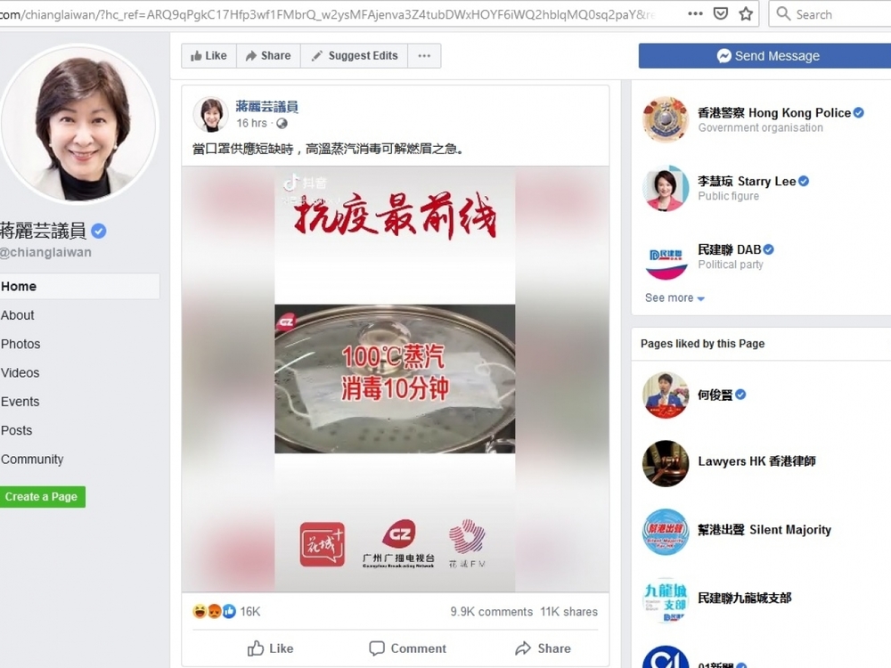 Pro-democracy lawmakers expressed shock today after a member of the Beijing-loyalist camp, Ann Chiang Lai-wan, posted a 10-minute video on her Facebook page explaining how to steam face masks so they can be re-used, RTHK reports.