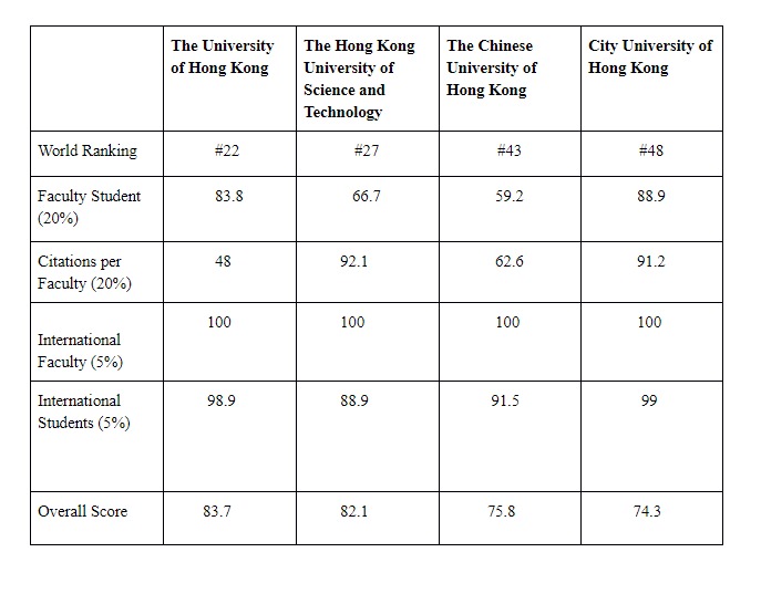 “CityU also achieved outstanding performance in a number of different sections, including “student internationalization” and “faculty-student ratio,” scoring 99 and 88.9 points respectively, higher than the three other universities,” the spokesman added.