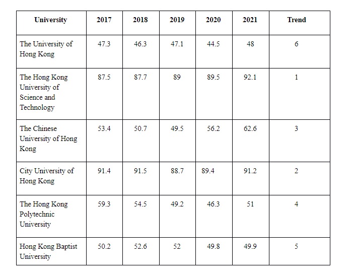 CityU scored 74.3 overall, just behind CUHK’s 75.8. CityU’s score in “citations per faculty” was 91.2 points, which is significantly ahead of HKU and HKUST, and is just 0.9 points below CUHK.