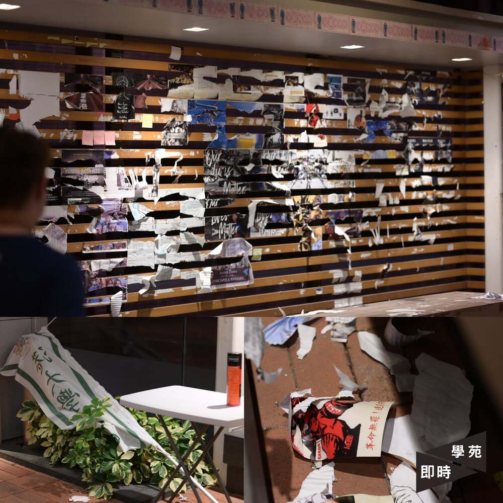 The spokesman for the university said that at around 7 pm on Saturday, around 30 people walked from the HKU MTR station to U-street to remove a batch of posters on the Lennon walls.