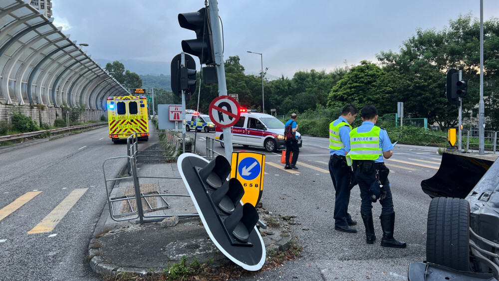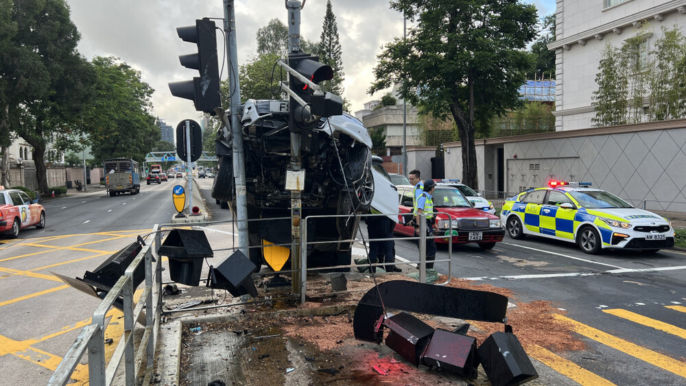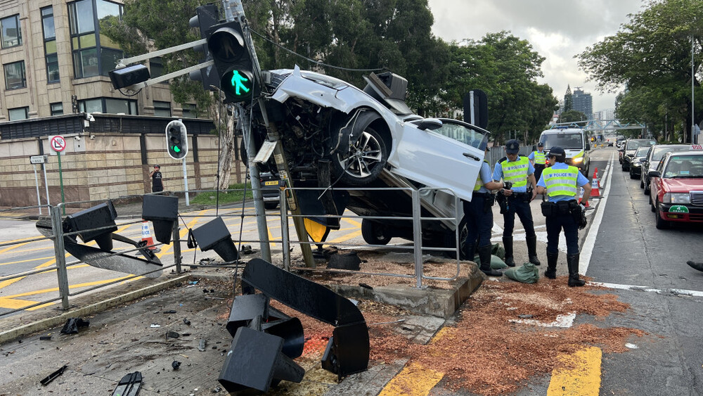 Around an hour later, an Audi sedan driving on Kowloon Tong Waterloo Road crashed into the safety island when it got near the junction of Hei Fuk Street and rammed three traffic lights.