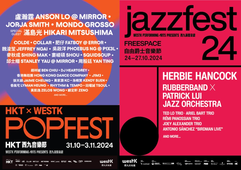 The West Kowloon Cultural District will stage two flagship music festivals - WestK Presents: Freespace Jazz Fest (Freespace Jazz Fest) and HKT x WESTK POPFEST (POPFEST) from October 24 to 27 and October 31 to November 3 respectively.