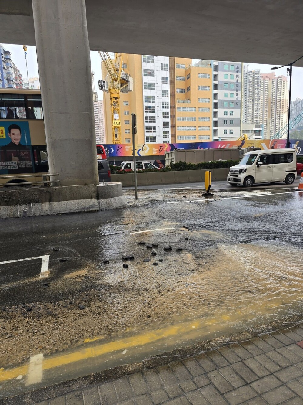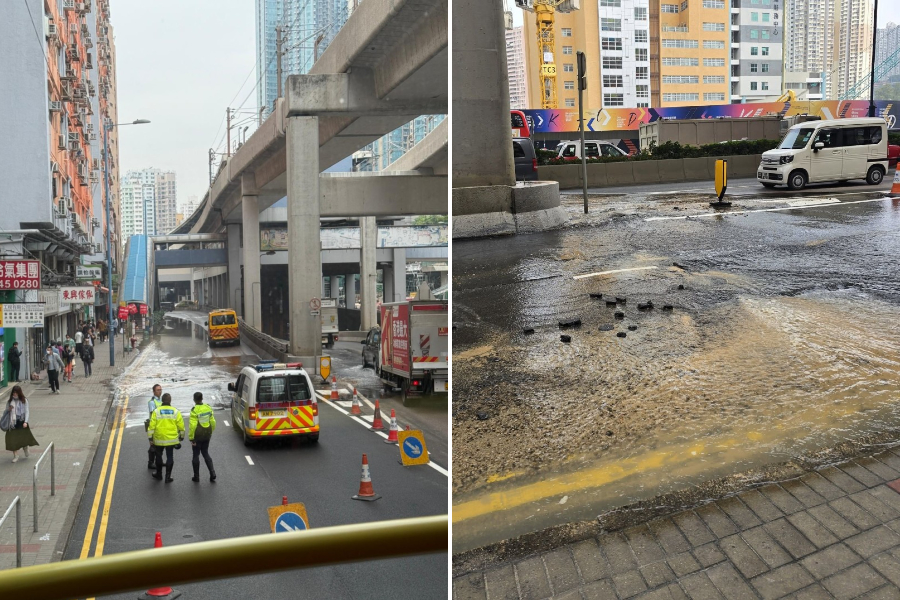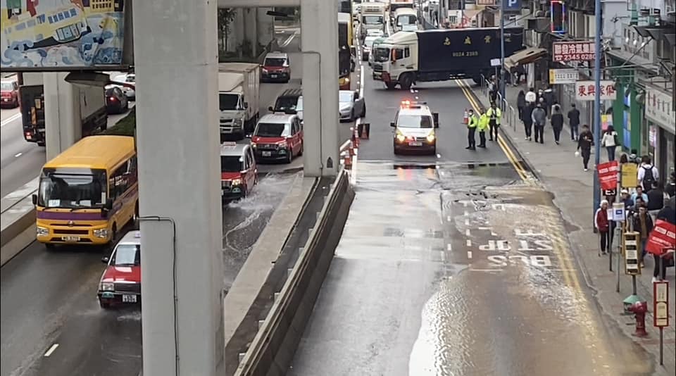 Police cordoned off the area and WSD staff were dispatched for emergency repairs. Part of the lanes of Kwun Tong Road (Mong Kok bound) is being closed to all traffic.