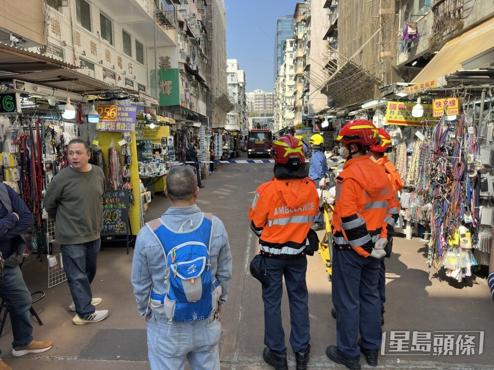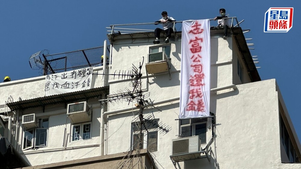 Three workers were observed sitting perilously on the roof of the Ming Chu Building in Sham Shui Po on Monday morning, protesting to demand their unpaid wages.