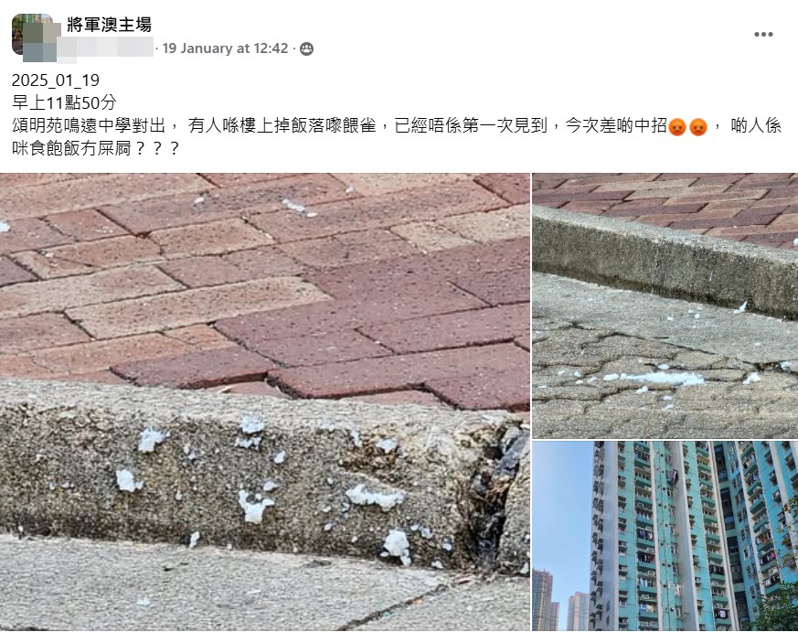 Writing on Facebook, the netizen said he was almost hit by the rice near Catholic Ming Yuen Secondary School, presumably thrown out the window by nearby residents who wished to feed the pigeons, at 11.50 am that day.