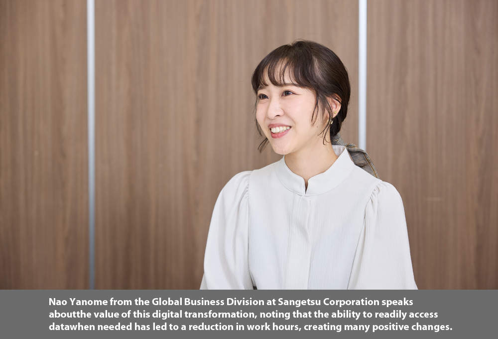 The on-site leaders took a collaborative approach, consulting with each team member to pinpoint specific business challenges. FUJIFILM Business Innovation, a pioneer in information digitisation since the advent of MFPs, was selected as the ideal partner to deliver the solution. The answer to managing and organising large volumes of documents and files was the implementation of the integrated platform FUJIFILM IWpro. Nao Yanome, who oversees export operations in Sangetsu’s Global Business Division, elaborated, “We revolutionised case-management information attribution and made the classification of all documents accessible on the cloud. By organising the information effectively, we gained visibility into each person's work progress, which had previously been opaque to those outside the division. This initiative also fostered a proactive work culture, encouraging employees to identify colleagues who might be lagging and to offer their support.”