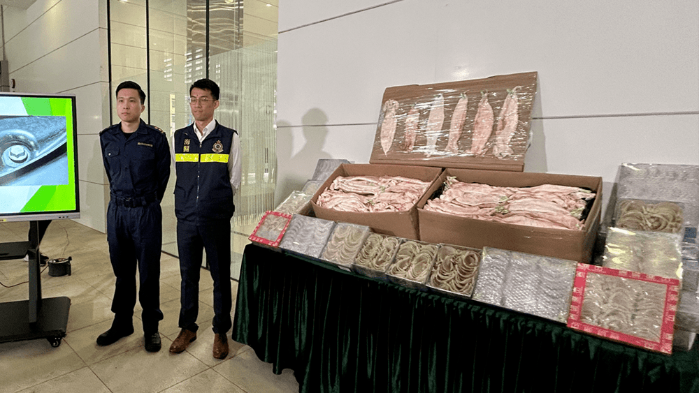 Hong Kong Customs seized about 24 kilograms of suspected smuggled bird's nests and 43 kilograms of scheduled fish maw, valued at approximately $5.2 million, from a private car at the Hong Kong-Zhuhai-Macao Bridge (HZMB) Hong Kong Port on February 20.