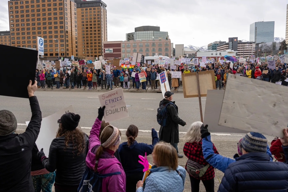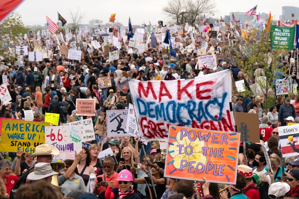 Thousands of protesters in cities dotting the nation from Midtown Manhattan to Anchorage, Alaska, including at multiple state capitols, assailed Trump and billionaire Elon Musk 's actions on government downsizing, the economy, immigration and human rights. On the West Coast, in the shadow of Seattle's iconic Space Needle, protesters held signs with slogans like “Fight the oligarchy.” Protesters chanted as they took to the streets in Portland, Oregon, and Los Angeles, where they marched from Pershing Square to City Hall.