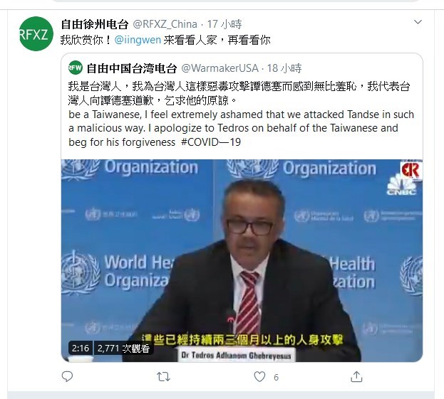 After Chinese-language media reported Tedros' accusations Thursday, social media posts began appearing promoting the idea of issuing apology messages in Taiwan's name, the bureau said, adding that investigators had traced the accounts in question to China.