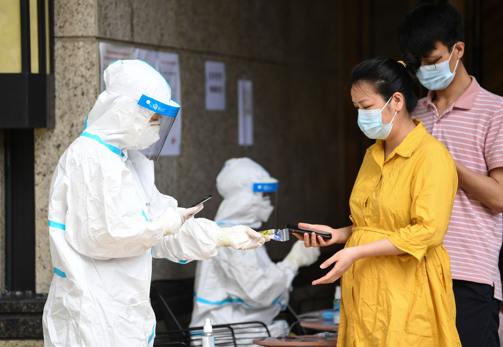 Volunteers register information of residents receiving nucleic acid test for the coronaviorus disease at a residential community in Guangzhou, Guangdong province, June 12, 2021. Massive testing campaigns have been launched in middle and high-risk areas in the city.