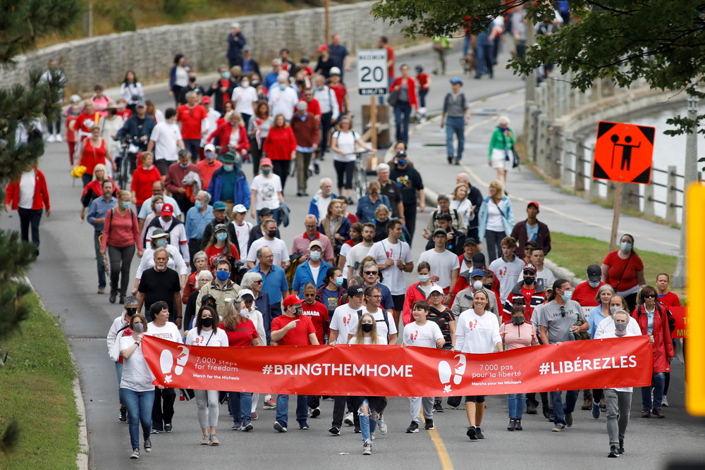 Hundreds of supporters of two Canadian men being held in China on what Ottawa says are specious charges marched 7,000 steps through the Canadian capital on Sunday to mark the pair's 1,000th day of "unjust" detention.