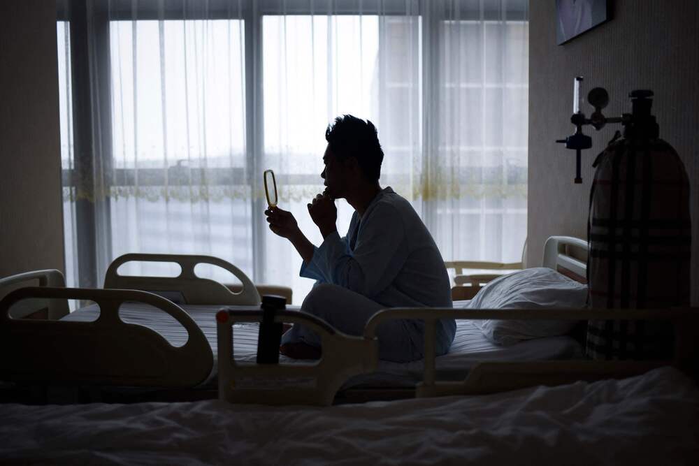 Man looking in a mirror after his plastic surgery at a clinic in Beijing. Worried his appearance would detract from opportunities in China's competitive society, he decided to go under the surgeon's knife to reshape his nose.