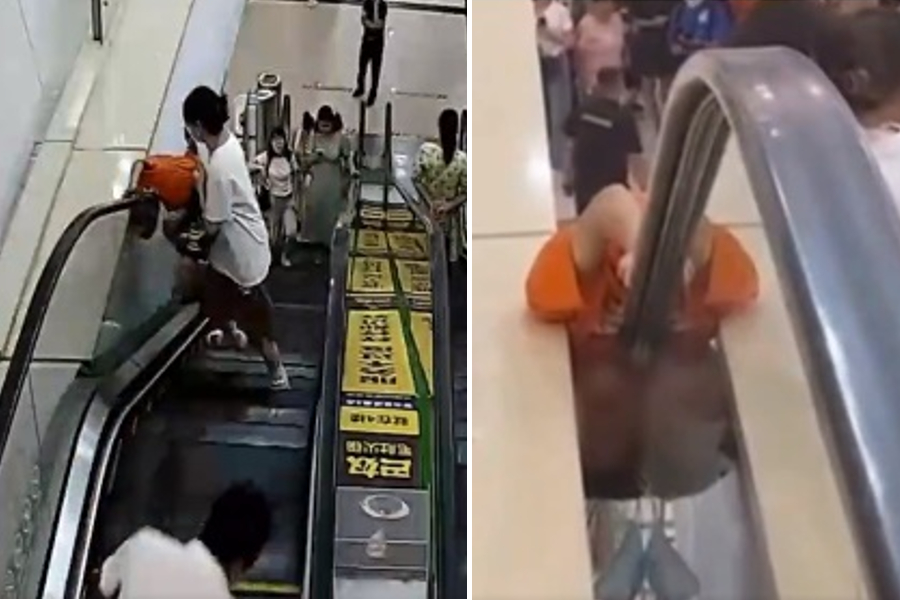 The video, posted on Saturday by the Fire and Rescue Department of the Ministry of Emergency, showed the boy sticking his head and arm out of the escalator in a mall in Xinyang city.