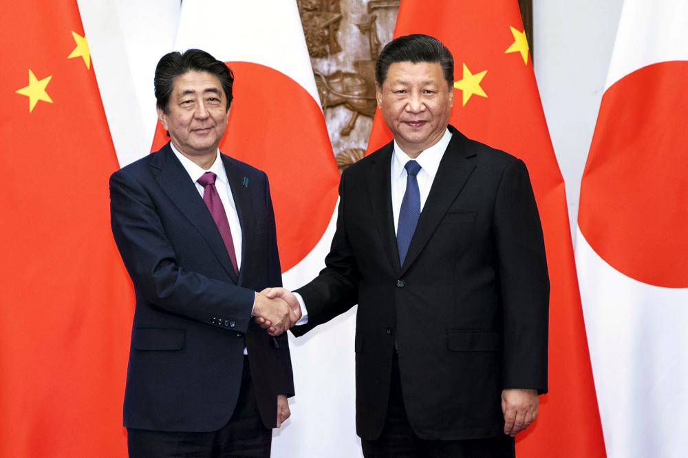In this photo released by Xinhua News Agency, Japanese Prime Minister Shinzo Abe, left, shakes hands with Chinese President Xi Jinping as they pose for photographers before a meeting at the Diaoyutai State Guesthouse in Beijing on Oct. 26, 2018. (Xinhua via AP)