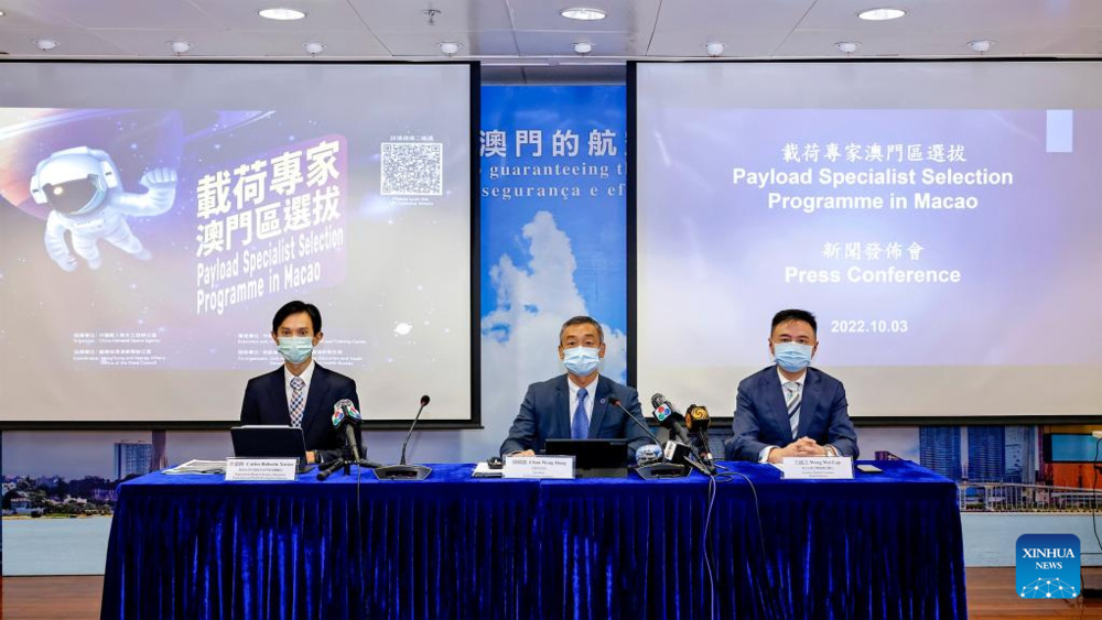 A press conference on selecting payload specialist in China's Macau to join national space program is held in Macau, south China, Oct. 3, 2022. (Xinhua)