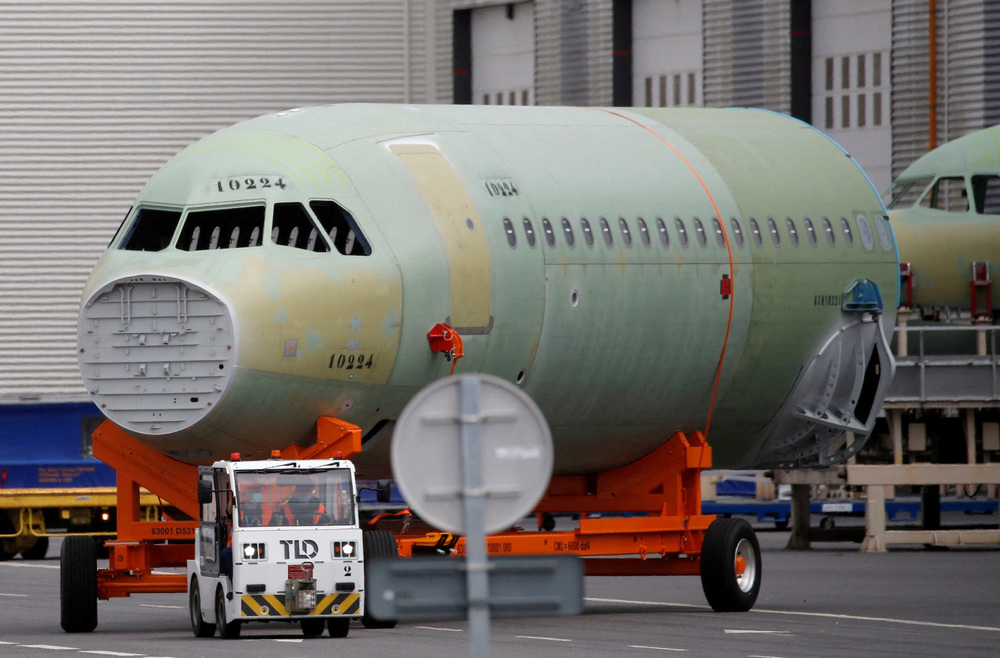 A fuselage section of an Airbus A320-family aircraft is transported at the Airbus facility. (Reuters)