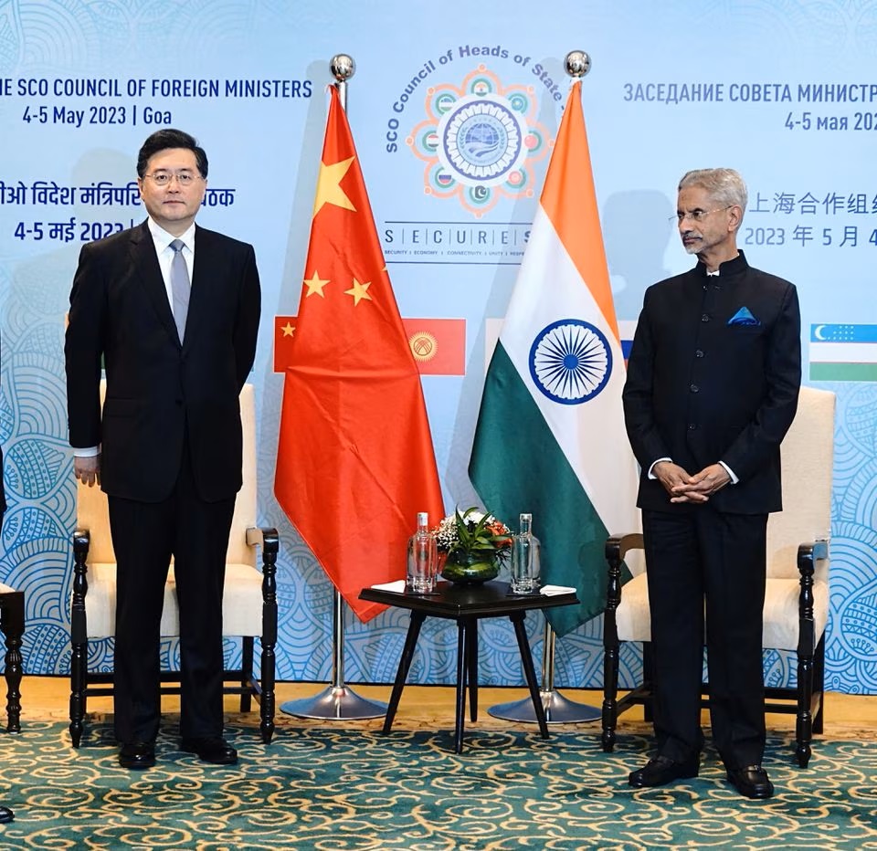 India's Foreign Minister Subrahmanyam Jaishankar and his Chinese counterpart Qin Gang pose for a photograph during the SCO Council of Foreign Ministers' meeting in Goa, India, May 4, 2023. (Reuters)