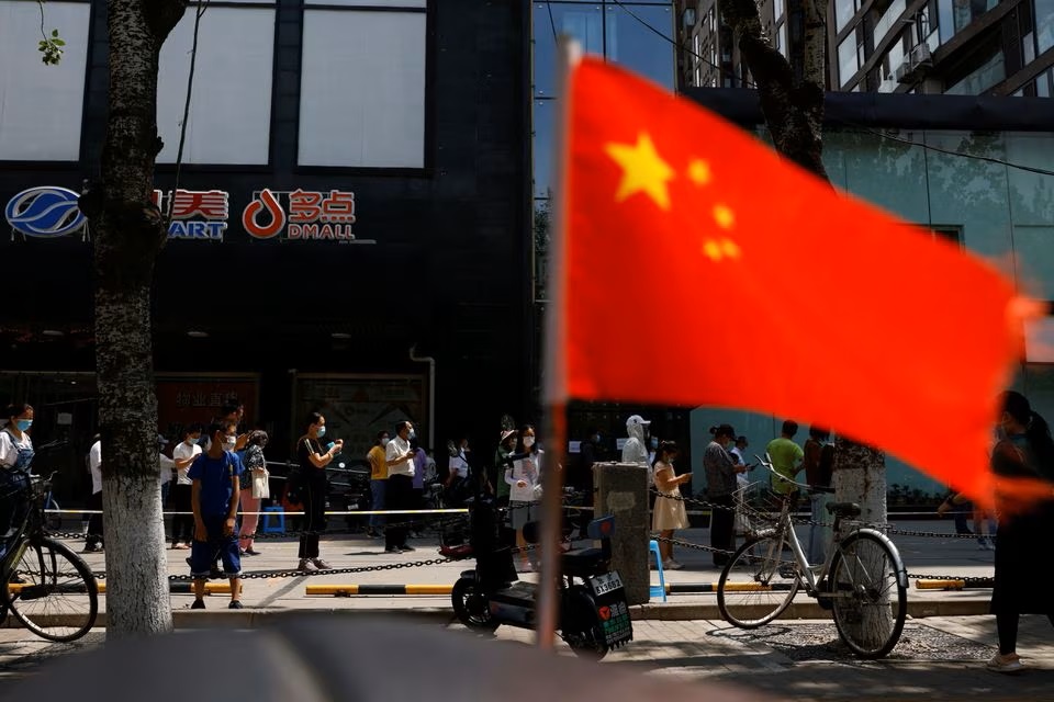 A China's flag flutters near people lining up to get tested at a makeshift nucleic acid testing site. (Reuters)