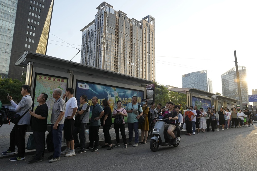 Residents line up for public transportation in Beijing, Tuesday, Aug. 15, 2023. Chinese leader Xi Jinping has called for patience in a speech released as the ruling Communist Party tries to reverse a deepening economic slump and said Western countries are 'increasingly in trouble' because of their materialism and 'spiritual poverty.' (AP Photo/Ng Han Guan) (ASSOCIATED PRESS)