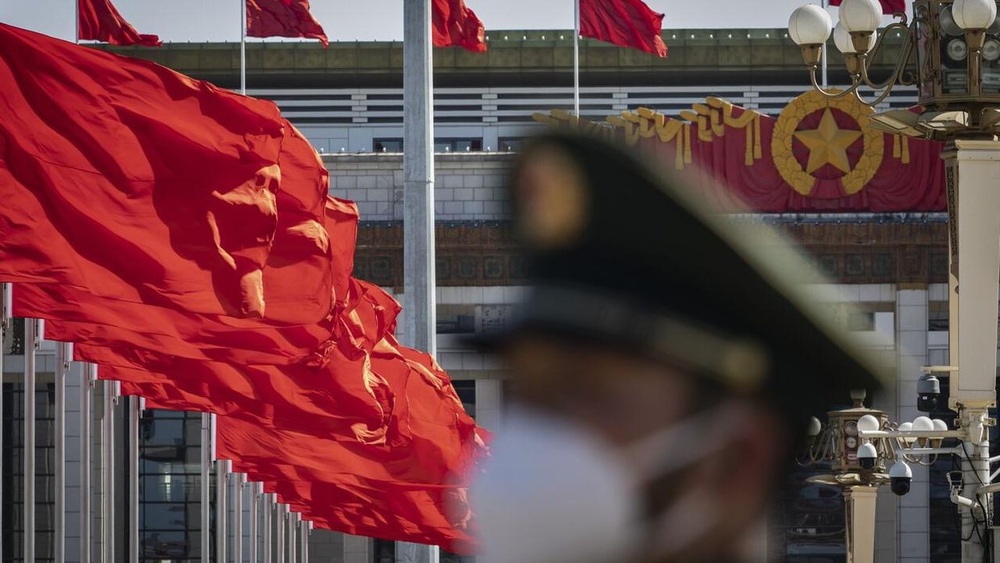 A member of the Chinese People's Armed Police Force stands guard as a Chinese national flag flies over Tiananmen Square along with other red flags ahead of the fifth plenary session of the First Session of the 14th National People's Congress (NPC) in Beijing, China, on Sunday, March 12, 2023. China reappointed several top economic officials in a leadership reshuffle Sunday, giving investors greater continuity as Beijing overhauls financial regulation and grapples with escalating tensions with the US. Photographer: Qilai Shen/Bloomberg