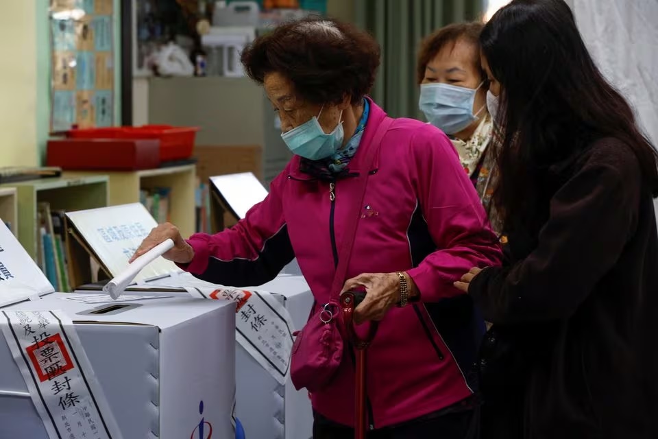 A woman casts her vote at a polling station during the presidential and parliamentary elections in New Taipei City, Taiwan January 13, 2024. REUTERS/Carlos Garcia Rawlins