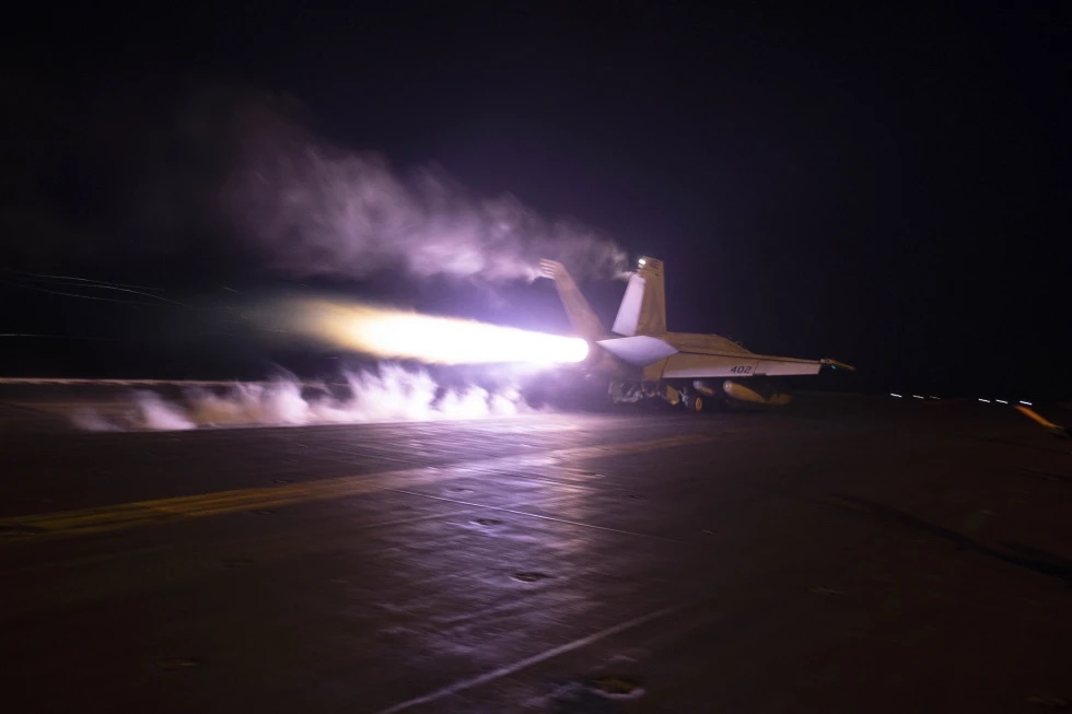 This image provided by the U.S. Navy shows an aircraft launching from USS Dwight D. Eisenhower (CVN 69) during flight operations in the Red Sea, Jan. 22, 2024. The United States and Britain struck 36 Houthi sites in Yemen on Saturday, Feb. 3, in a second wave of assaults meant to further disable Iran-backed groups in the region. (Kaitlin Watt/U.S. Navy via AP)