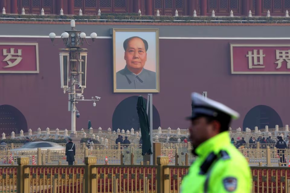 A police officer keeps watch in front of a portrait of the late Chinese chairman Mao Zedong on the Tiananmen Gate, near the Great Hall of the People in Beijing, China March 7, 2024. REUTERS/Florence Lo/File Photo