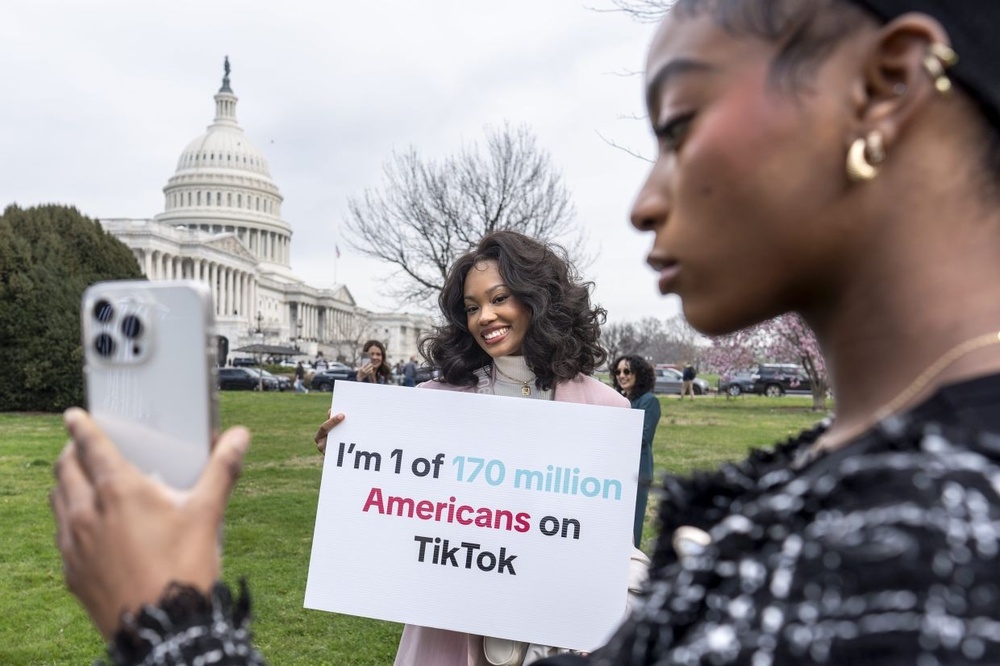 Devotees of TikTok, Mona Swain, center, and her sister, Rachel Swain, right, both of Atlanta, monitor voting at the Capitol in Washington, as the House passed a bill that would lead to a nationwide ban of the popular video app if its China-based owner doesn't sell, on March 13, 2024. — AP
