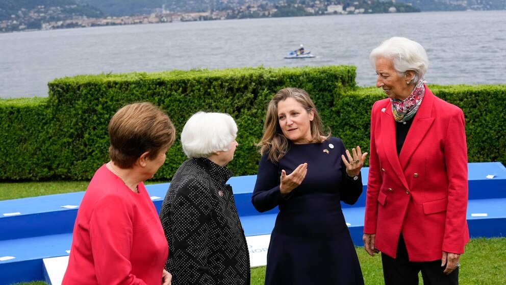 From left, International Monetary Fund Managing Director and Chairman of the Executive Board Kristalina Georgieva, United States' Treasury Secretary Janet Yellen, Canada's Finance Minister Chrystia Freeland and President of the European Central Bank Christine Lagarde meet during the G7 Finance Ministers meeting in Stresa, northern Italy, Friday, May 24, 2024. (AP Photo/Antonio Calanni)