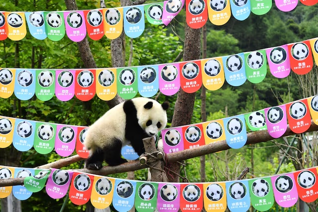 A giant panda cub plays on tree branches surrounded by photos of giant panda cubs who were born in 2018, during a birthday celebration at Shenshuping panda base in Wolong, Sichuan province, China July 25, 2019. An Yuan/CNS via REUTERS/File photo
