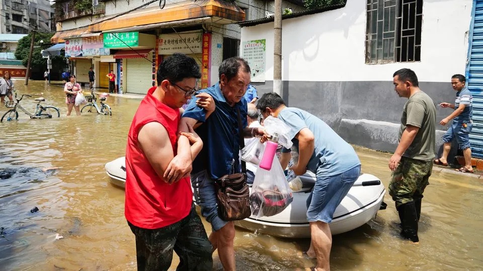 A rescue worker assists a resident on a flooded street after storms in Guilin, in southwestern China's Guangxi province on June 20, 2024. - Stringer/AFP/Getty Images